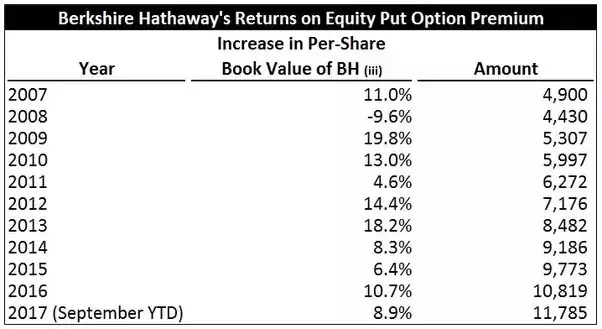 [3] Berkshire Hathaway received $4.9 billion in up-front premiums in 2007. This cash could be invested anywhere throughout the conglomerate. Based on Berkshire Hathaway’s growth in book value per-share since 2007, these premiums would grown to close to $12 billion by the end of 2017: