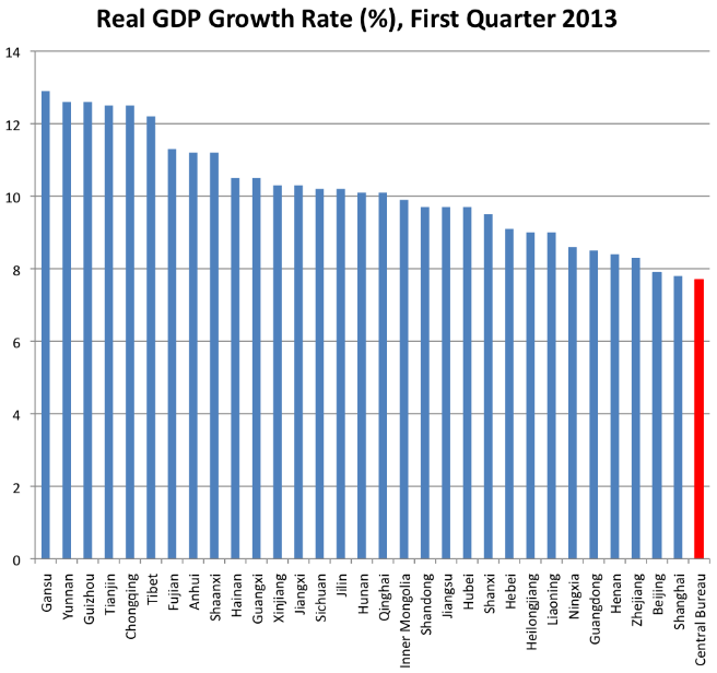 In the April, China's central government and provincial authorities released data on the country's economic performance for the first quarter of 2013. On April 15, the National Bureau of Statistics announced that the country's year-on-year real GDP growth rate had been 7.7 percent.