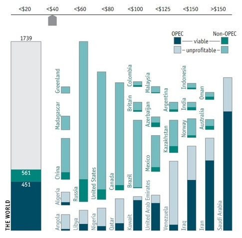On the other end of the scale, in Saudi Arabia, getting oil out of the ground is like sticking a straw in a juice box i.e. extremely cheap. From this perspective, Saudi Arabia is in one of the best positions to weather a prolonged period of low oil prices.