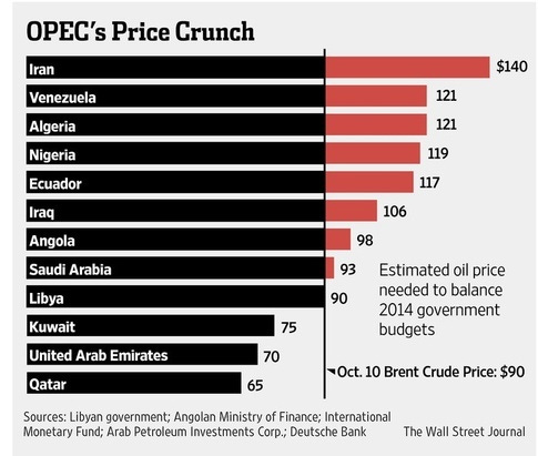Based on a combination of (i) fiscal position (ii) quality of oil assets and (iii) underlying social dynamics, within OPEC the most vulnerable major countries are Iraq and Venezuela. With its large, youthful and fast-growing population and the risk of having groups like Boko Haram mucking things up, I suspect Nigeria is dicey as well.