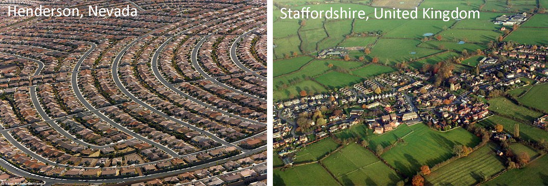 Most Americans live in suburbs which are dominated by single-family homes sitting on single tracts of land extending for miles (i.e. “suburban sprawl”). This contrasts sharply with the way towns were developed in the pre-automobile era, which is when most European towns and villages first came into existence — these were designed around the primary mode of transportation of the era, a.k.a. “your feet”. One consequence of this is the greater use of mixed-use development strategies where commercial and residential interests are located in close proximity i.e. the traditional European village/town square.