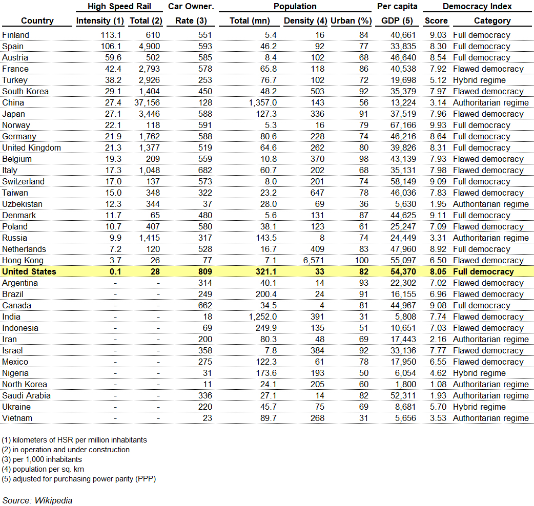 This all results in car ownership rates that are much higher compared to almost every other major country (as you can see in the data table above). Lower car ownership rates create greater demand for alternative transportation options and makes high-speed rail a much more attractive proposition in those countries.