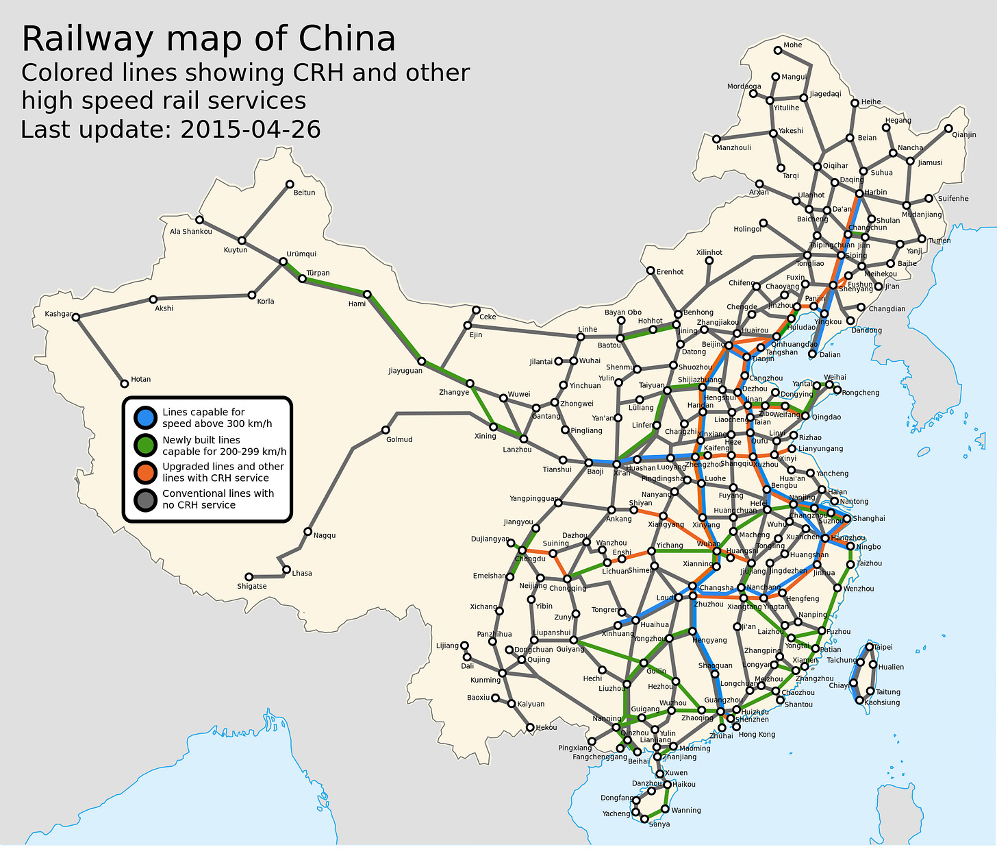 Again — especially if you factor in the gray lines, many of which are candidates to be upgraded to high-speed rail lines — this is a pretty intricate web of cities, and once again supports the economics of high-speed rail. Now you will notice a few lines (such as the ones extending out across the Silk Road to Urumqi or towards Lhasa) that are more point-to-point in nature. But these lines are probably subsidized to a large extent by the much more highly utilized lines in the Eastern half of the country.